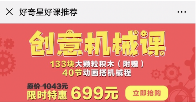 經(jīng)作者對(duì)比,好奇星少兒創(chuàng)客公眾號(hào)上顯示,好奇星創(chuàng)意機(jī)械課的售價(jià)是699元,而盜版售價(jià)只要9.8元。