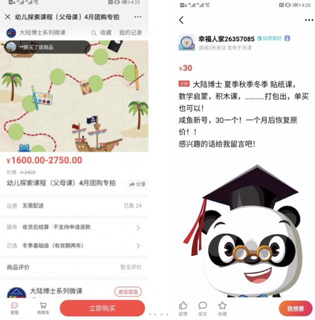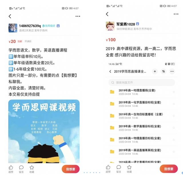 今日,筆者經(jīng)閑魚(yú)二手交易平臺(tái)中搜索“學(xué)而思”、“好奇星創(chuàng)意機(jī)械課”、“大陸博士”等關(guān)鍵詞時(shí),發(fā)現(xiàn)了大量低價(jià)的盜版在線(xiàn)教育資源。
