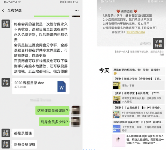 而進(jìn)一步和“全布好課”聊天,很多新的課程資源是他購(gòu)買(mǎi)后進(jìn)行翻錄,超級(jí)會(huì)員費(fèi)用為598元,不打折。像“全部好課”的這樣微信經(jīng)營(yíng)者很多,他們依靠長(zhǎng)期積攢的盜版在線(xiàn)教育資源,通過(guò)“眾籌”、“會(huì)員”等模式進(jìn)行非法獲利,并通過(guò)百度網(wǎng)盤(pán)群等進(jìn)行非法傳播,傳播范圍及受損失的在線(xiàn)交易企業(yè)的數(shù)量等危害都遠(yuǎn)超單個(gè)盜版資源傳播帶來(lái)的影響。