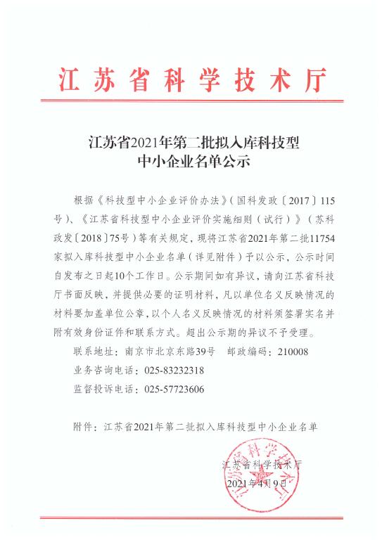 江蘇省2021年第2批擬入庫科技型中小企業(yè)名單公示