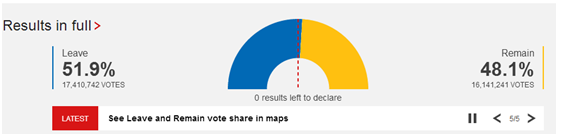 據(jù)BBC新聞報道,英國當?shù)貢r間6月24日上午7點,英國脫歐公投所有計票全部結束,最終的結果鎖定在了51.9%支持脫離歐盟,48.1%的票數(shù)選擇留在歐盟,雙方陣營之間票數(shù)差距達到近130萬。至此,英國脫歐公投塵埃落定,在脫歐和留歐陣營之間反反復復進行了一年有余的拉鋸戰(zhàn)終于敲定。